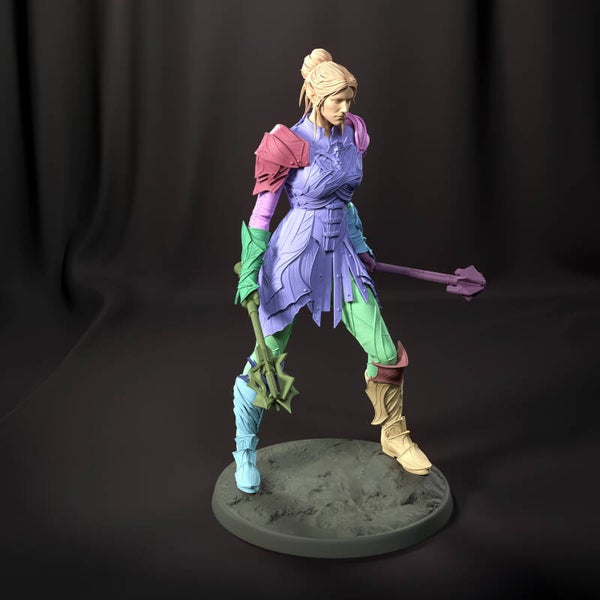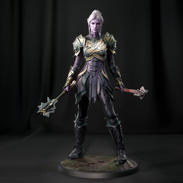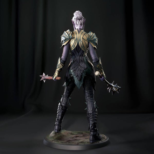 Cette figurine représente une guerrière nocturne, stratège impitoyable aux origines énigmatiques. Son regard perçant et son port imposant témoignent de son autorité naturelle et de son habileté à manier aussi bien les armes que l’intrigue. Sa tenue finement sculptée et son armure élégante reflètent son appartenance à un monde où pouvoir et loyauté se forgent dans l’ombre.
