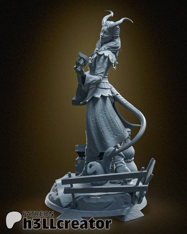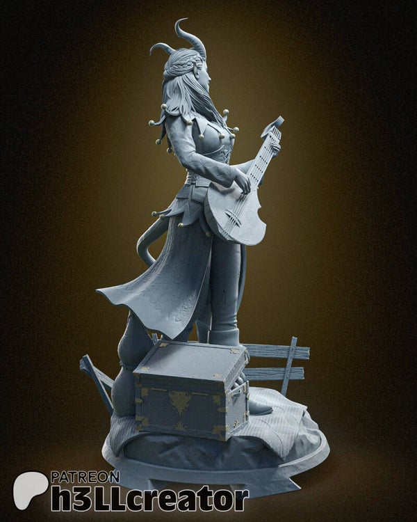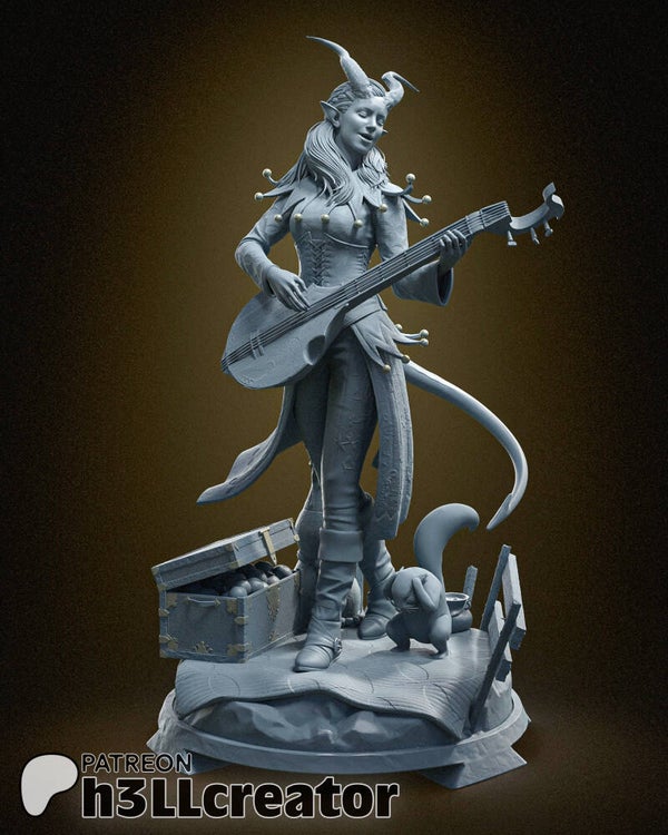 Alfira est représentée en pleine performance, tenant son luth délicatement décoré, dans une pose paisible mais pleine d’émotion. Sa tenue aux motifs colorés, ses cheveux magenta ondulant, et ses cornes finement sculptées en font une figurine vibrante de personnalité. À ses pieds, un tapis, un coffre débordant d’agrumes et un petit compagnon rongeur ajoutent une touche de chaleur et de vie à la scène.