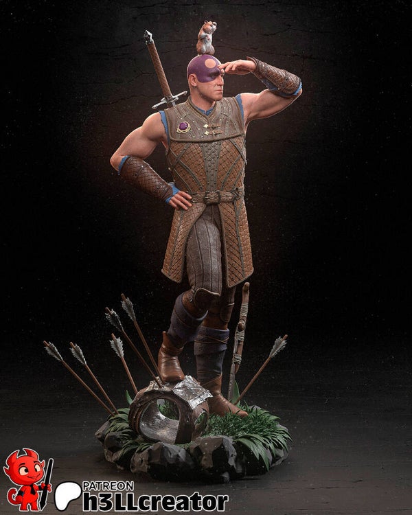 Minsc est représenté dans une posture de veilleur héroïque, l’œil plissé à l’horizon, prêt à foncer pour le bien… et pour Boo, son fidèle hamster miniature mais redoutable, confortablement perché sur son crâne chauve. Son armure texturée, son épée dans le dos, les flèches plantées autour de son socle forestier — tout est pensé pour évoquer ses aventures épiques (et parfois loufoques).